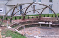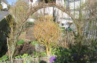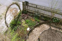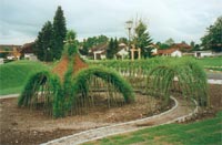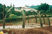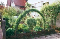 Gartenanlage mit geflochtener Beeteinfassung Grüner Bogen mit Weidenkugel, Kopfweiden und Weidenspalier mit Clematis bepflanzt. |