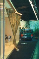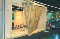Gedrehter Raumteiler mit Weidenstangen (Ø 4-5 cm) auf Stahlseil aufgefädelt (Messestand auf der Galabau Nürnberg) |